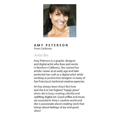 About the Artist: Amy Peterson started working on her craft at an early age and continues to sharpen her skills as a production artist in many of San Francisco’s technical creative agencies. Creating colorful and uplifting art is the key to Amy’s “Happy Place.” Her favorite pieces come together with the helping hands of a good cup of coffee and some great music. Nothing ignites her passion like creating work that brings joy and good vibes into the world!
