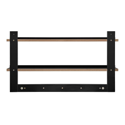 - Space-saving coat rack storage shelf in Black laminate MDF finish with Black wood hanging hooks in a chic, modern design that incorporates easily into any room style