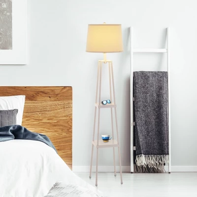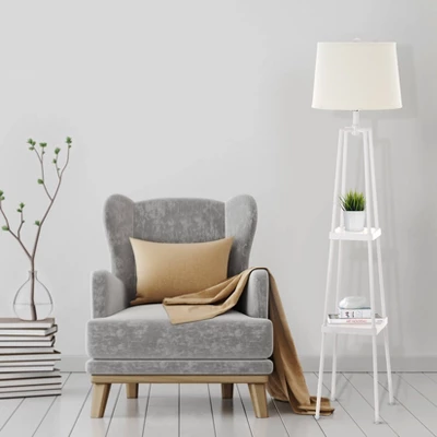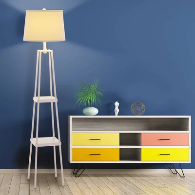 - STYLISH AND MULTIFUNCTIONAL: This space-saving étagère shelf floor lamp features a sturdy metal body with matte black finish and beige linen shade. The versatile design provides additional storage with two built-in shelves, making it the perfect addition to your living room, family room, bedroom, dorm room, home office, craft room, kitchen or any open concept living space. Great for apartment living or DIY home remodeling projects and suits a variety of styles including modern, transitional, contemporary, industrial, global, farmhouse, rustic and traditional decor.