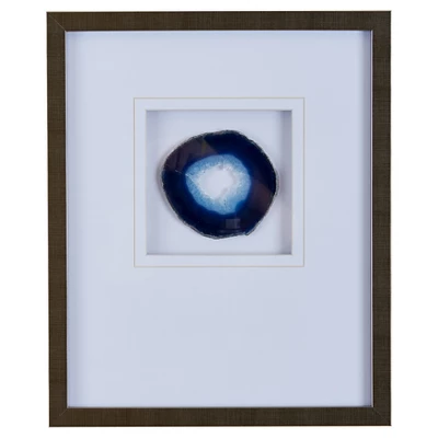 Deck out your walls with this standout piece of art. Agate is a decorative display of a real 4″ cut of a geode and framed under glass. Each cut is a one of a kind piece and distinct from each other. This will be a beautiful display on its own or it would look great as a set. As this unique piece uses 100% real agate stone, color variations may occur from the image due to the natural state of each agate stone. (Artist: Studio 5)