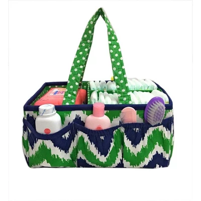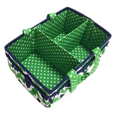 Add organization to any area of your home with the portable Nursery/Toddler Storage Caddy by Bacati. Perfect for dressers and changing stations, this lightly padded caddy has 8 outer pockets and a removable “T” separator for maximum versatility. The soft cotton percale fabric with stiffner inside keeps the shape intact, lining and handles feature a padded with polyfilled and cordinating trim. Keep diapers, wipes and other necessities tidy while traveling from room to room. Caddy also functions as an organizer for crafts, picnics, pet supplies, etc. Measures 12.5 in x 6.25 in x 8.5 in.