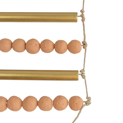 - Natural terracotta clay beads contrast solid brass bars, softened by a jute tassel creating a dimensional and textural wall accent.