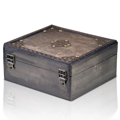 - Outer size 7.9″x7.1″x3.5″, inner 7.1″x6.3″x2.2″, vol. 54 oz/1.6 liter, gray w/metal, hinged closure, no lock, plywood.