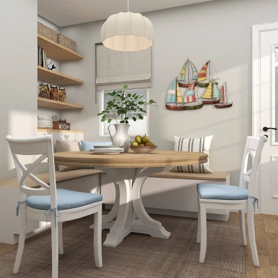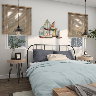 Bring vivid colors to your coastal-themed walls with this sailboat art wall Decor. This item ships in 1 carton. Iron wall decor makes a great gift for any occasion. Can be hung horizontally using the keyholes on the back; nails and screws not included. Suitable for indoor use only. This item ships fully assembled in one piece. This is a single multi colored wall sculptures. Coastal style.