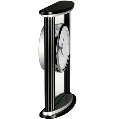 - This handsome wood and glass alarm clock features contoured sides, with wood top and base in a black satin finish. Satin silver-tone plates accent the top and base.