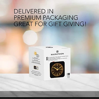 Marathon’s Mini Analog Alarm Clock with Auto-Night Light is the perfect combination of form and function. It features an elegant, classic design with a modern touch. Its compact design makes it ideal for home or travel. The ambient light sensor ensures the face of the clock is illuminated in the dark and easy to read. A sweeping second hand does not emit an audible tick. The Alarm ON/OFF and SNOOZE/LIGHT buttons are conveniently located on the top of the clock and are easily accessible even in the dark.