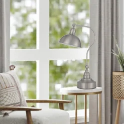 Cal Lighting Industrial adjustable metal down bridge desk lamp with half dome metal shade. This 25″ tall durable metal lamp is in Brushed Steel finish. This lamp features and adjustable head, adjustable arm, and a weighted base for added stability. This lamp uses a 60 watt bulb (not included) with an On/Off rotary switch. Add this Transitional styled floor lamp to your Livingroom, dining room, family room, bedroom, or office.