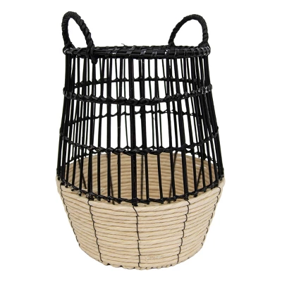 Make a statement with this natural and black handwoven rattan and maize rope basket. The contrasting colors give off a beautiful boho vibe. Its large size is great for displaying taller grasses or potted plants, storing your favorite throws, or simply as a textural decorative accent for your space.