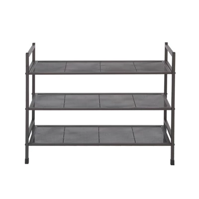 With a heavy-duty metal construction and a stylish pepper gray finish, this three-shelf shoe rack provides versatile storage to any room of your home. While each rack can hold up to 16 pairs of shoes, it also has a stackable design so that multiple units can be combined for a customized storage solution.