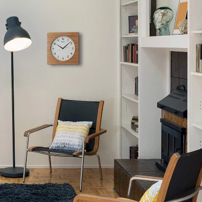 This clock is perfect for any modern interior. It has simple design features a square shape light wooden color case enhanced with zebra wood pattern veneer. Black numerals, black hand hour and minute hand and a silver color quiet sweep second hand. Black numerals, black hand hour and minute hand and a silver color quiet sweep second hand