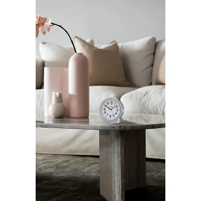 Stay on schedule with this alarm clock. The Everett Alarm Clock features a silver case with a plastic cover. The beep alarm comes complete with an auto constant light, automatic alarm stop after 5 minutes, light, snooze function, the quiet-sweep second hand eliminates ticking, and a get up and glow dial light illuminates the face.