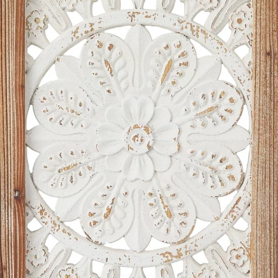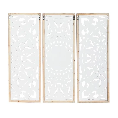 - This wooden wall decor set features 3 rectangular panels with floral patterns and decorative flourishes