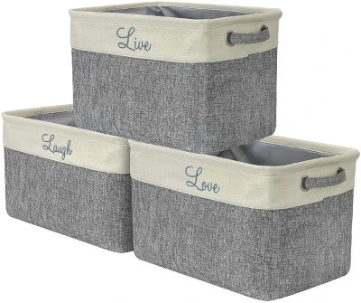 - DESIGN SPECIFICATIONS — Rectangular shape with rounded corners — Neutral tan and decorative grey bin color palette coordinates with most décor — Soft flexible material — Made of Cotton & Jute fabric — Lined with linen interior— Durable structure for heavy items — Easy to clean with dry or damp cloth — Measures approximately 15” L x 10.75” W x 9.50” H